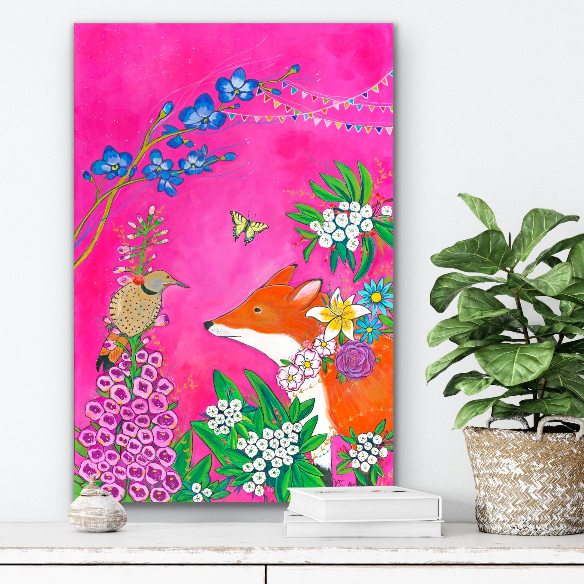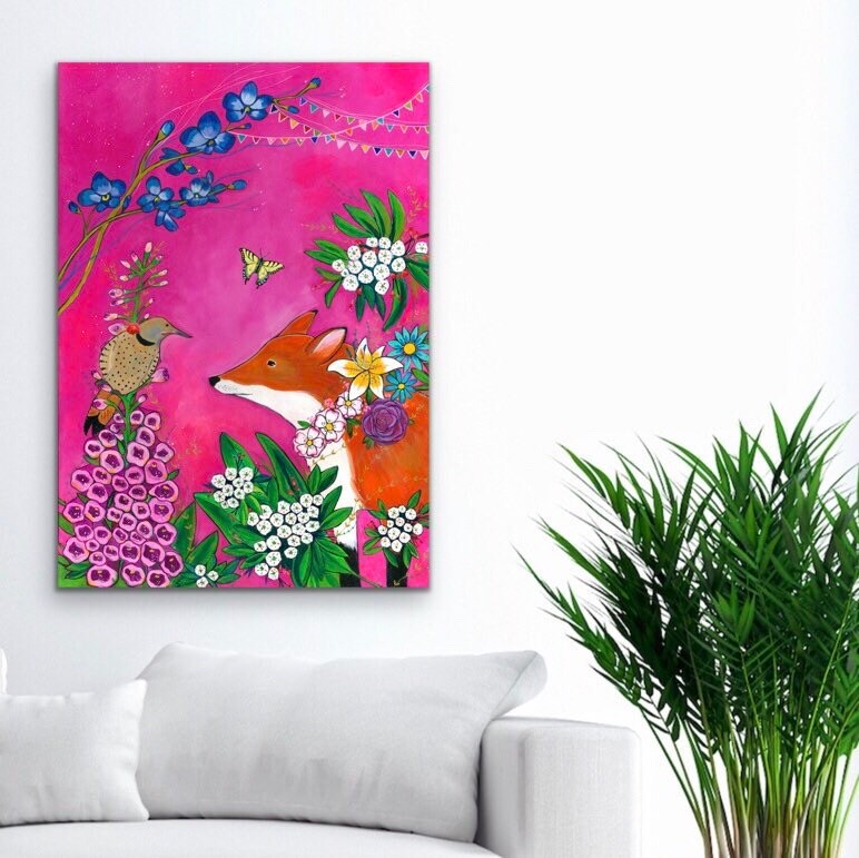 The canvas is stretched and wrapped on 1.5-inch wood bars and the painting image wraps around the sides. There is a wire attached to the back for easy hanging.