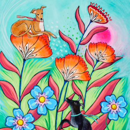 The canvas is stretched and wrapped on 1.5-inch wood bars and the painting image wraps around the sides. There is a wire attached to the back for easy hanging.