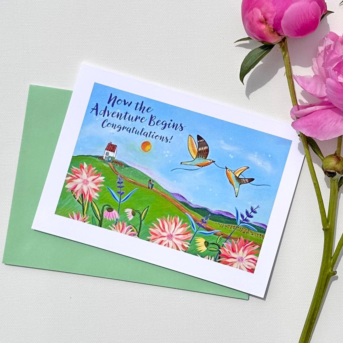 The front of this greeting card reads Now the Adventure Begins. Congratulations.