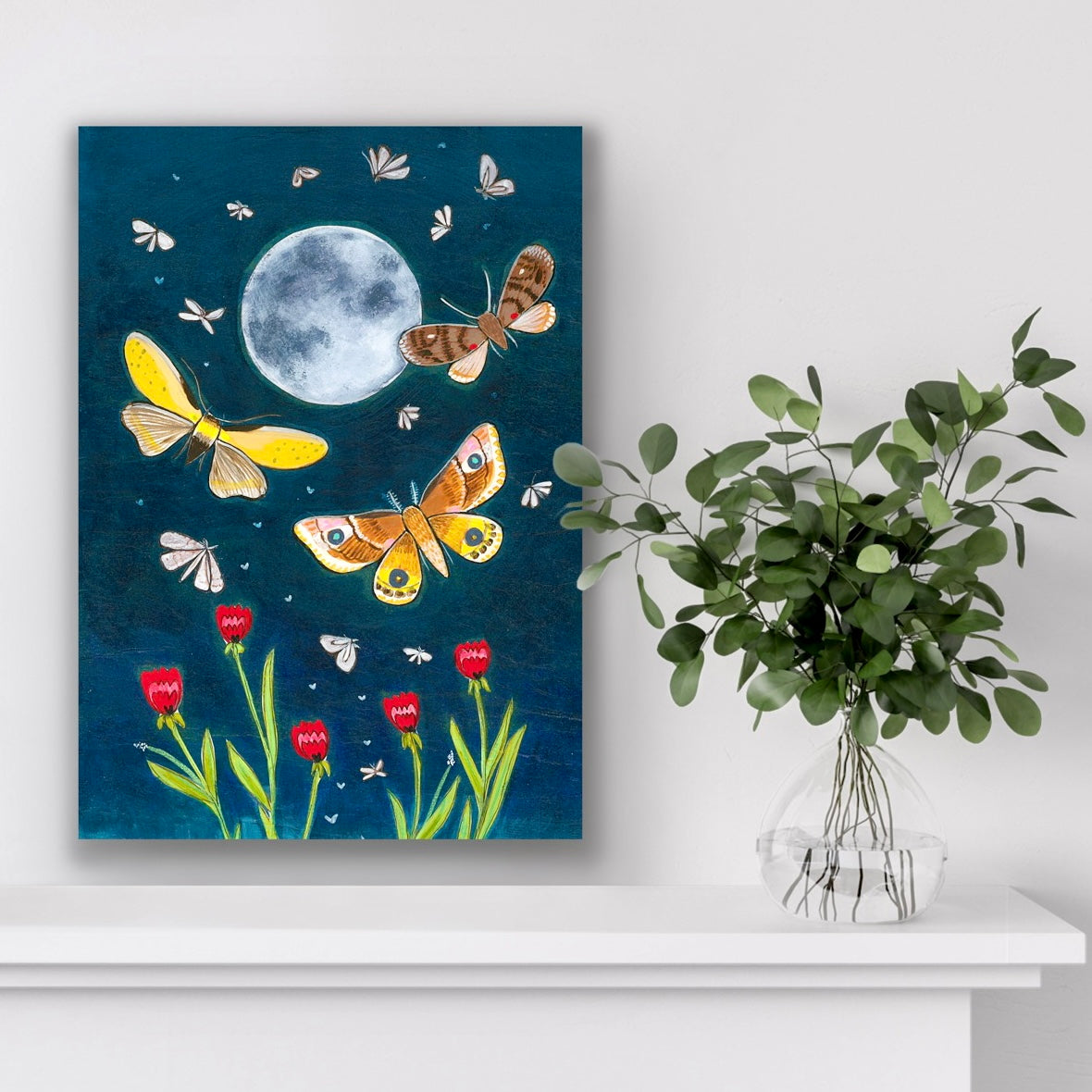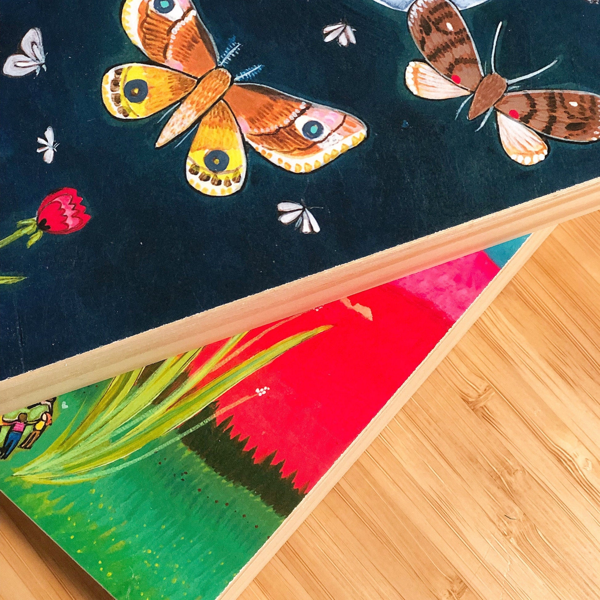 My assistants carefully glue each print to a cradled wood board in my studio and I add hand-painted embellishments. Once that is dry, I add several layers of a UV-protective acrylic topcoat to the whole piece. The sides are varnished wood finish and are 3/4.