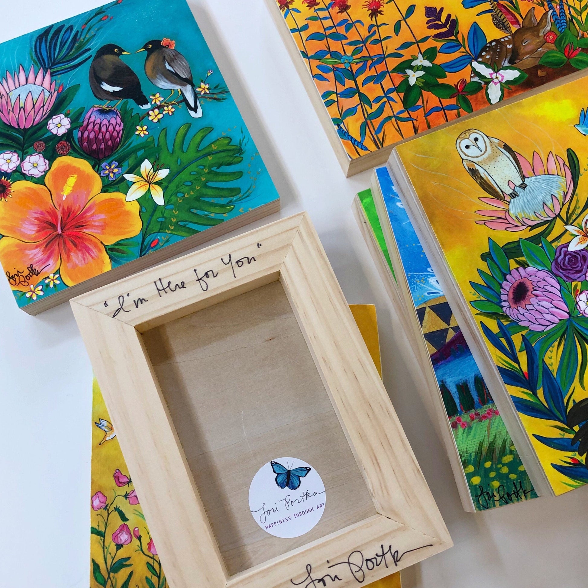 My assistants carefully glue each print to a cradled wood board in my studio and I add hand-painted embellishments. Once that is dry, I add several layers of a UV-protective acrylic topcoat to the whole piece. The sides are varnished wood finish and are 3/4".