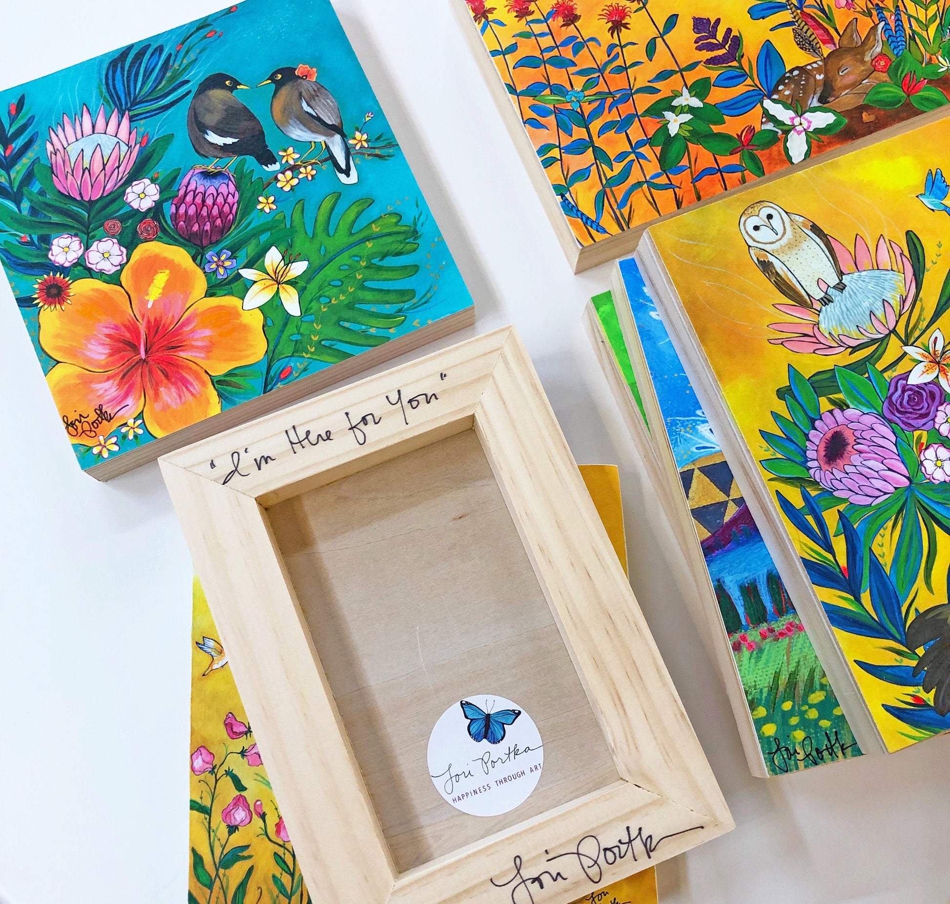 My assistants carefully glue each print to a cradled wood board in my studio and I add hand-painted embellishments. Once that is dry, I add several layers of a UV-protective acrylic topcoat to the whole piece. The sides are varnished wood finish and are 3/4".