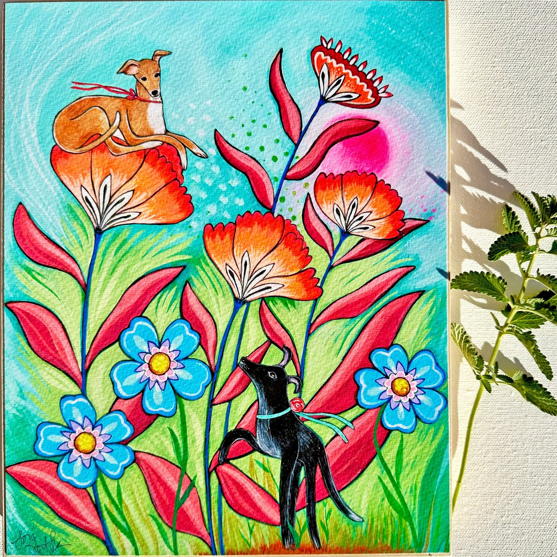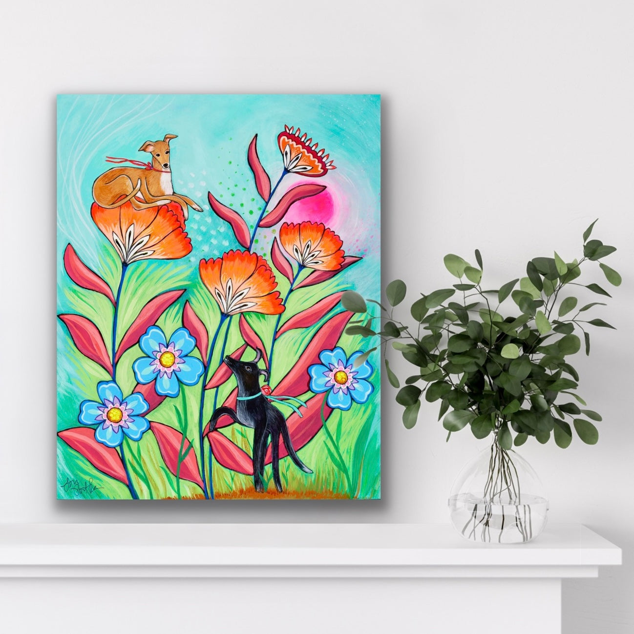 My assistants carefully glue each print to a cradled wood board in my studio and I add hand-painted embellishments. Once that is dry, I add several layers of a UV-protective acrylic topcoat to the whole piece. The sides are varnished wood finish and are 3/4".