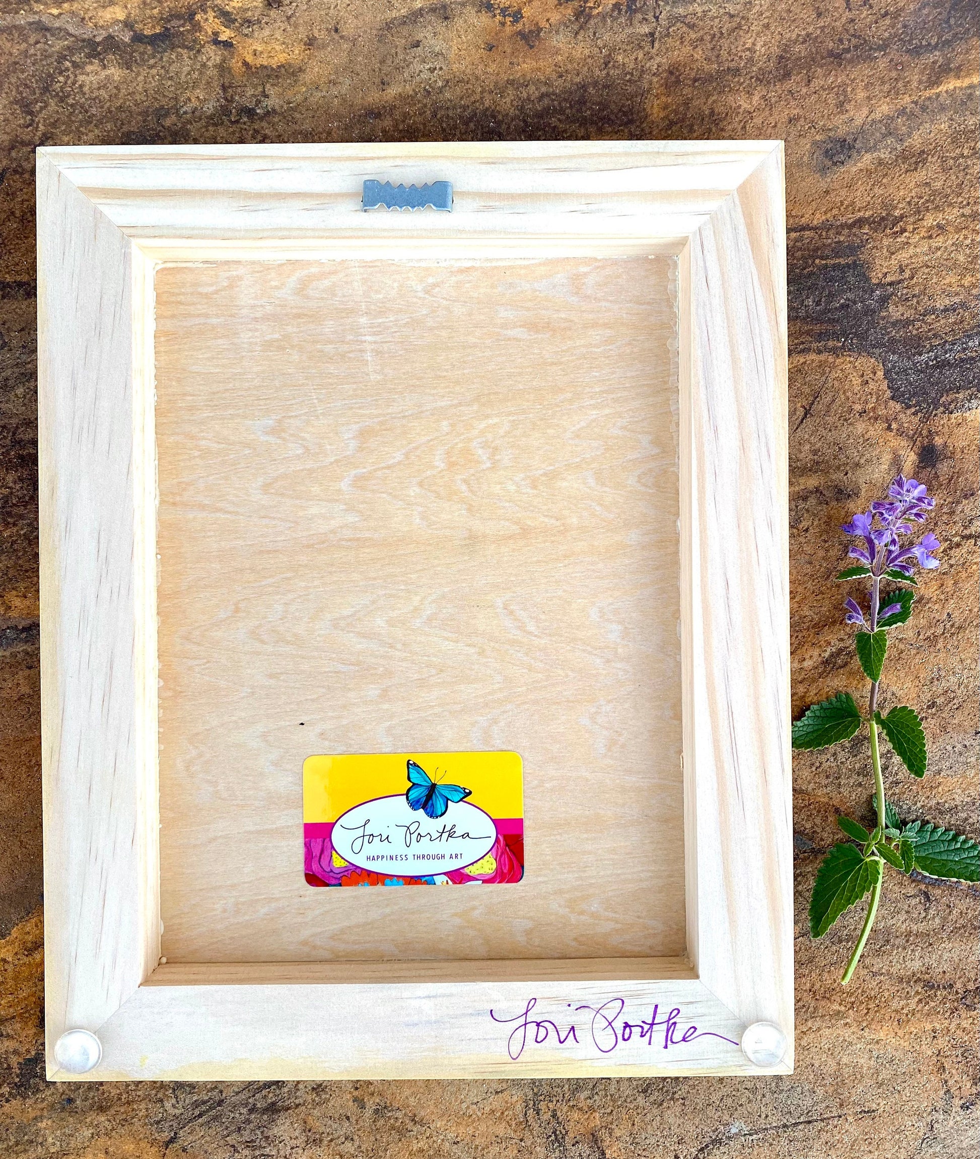 My assistants carefully glue each print to a cradled wood board in my studio and I add hand-painted embellishments. Once that is dry, I add several layers of a UV-protective acrylic topcoat to the whole piece. The sides are varnished wood finish and are 3/4".